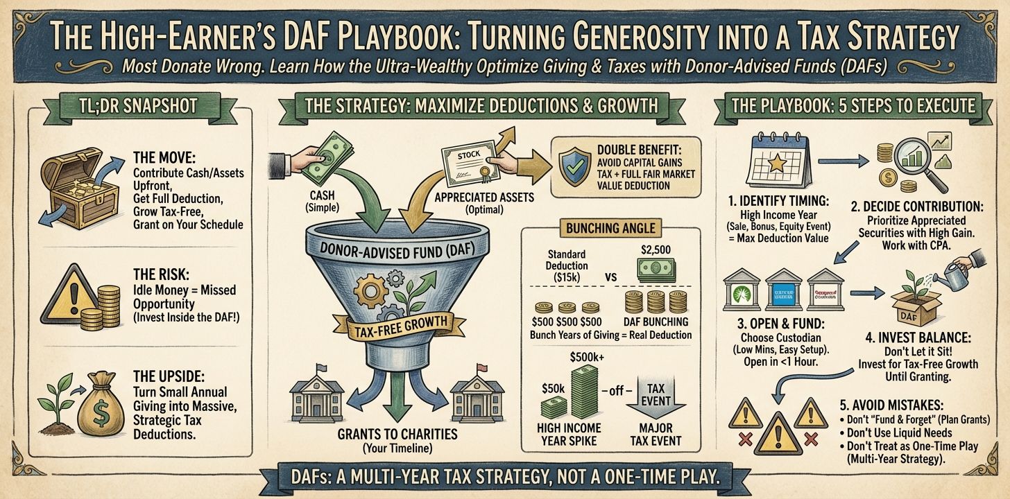 The move: Contribute cash or appreciated assets to a DAF, claim the full deduction upfront, let it grow tax-free, and grant to charities on your schedule.